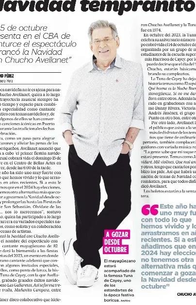 Arrancó la Navidad con Chucho Avellanet es el nombre del espectáculo con que el cantante mayagüezano de 82 años le dará la bienvenida a las fiestas navideñas del 2023, un evento en donde el veterano cantante adelantó que contará con algunos invitados especiales, entre ellos, como punta de lanza, la histórica Tuna de Cayey, con la que Avellanet ha grabado grandes éxitos navideños, como Las Gallaretas, Así se forma tremenda trulla, Mañanita Campera, entre otros.